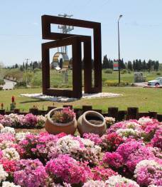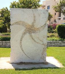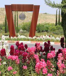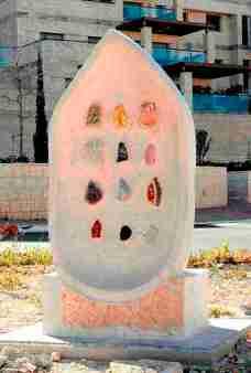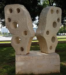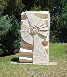 פסל מתכת חלוד בגובה ורוחב 5 מטר של הפסלת מרשה ראף (Marcia Raff) . צורתו כאבן הָרֹאשָׁה או אבן המפתח.