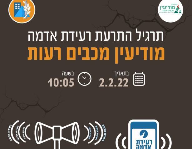 לראשונה יערוך פיקוד העורף בשיתוף עם עיריית מודיעין מכבים רעות, תרגול התרעה לרעידת אדמה, אשר יבחן את היכולת החדשה לספק התרעה לרעידת אדמה ועל מנת שהתושבים יכירו את ההתרעה ויידעו כיצד לפעול במצב חירום שכזה.