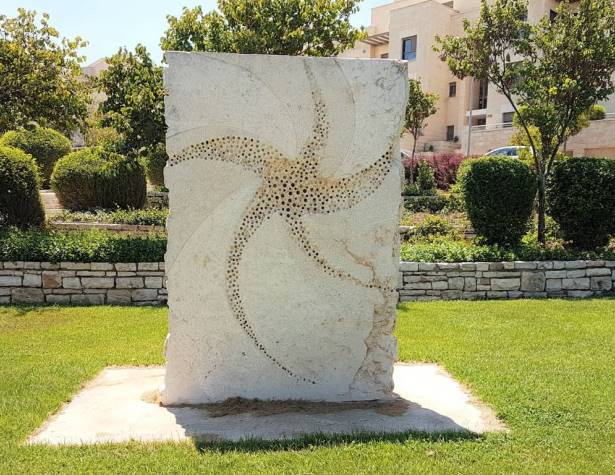 פסל מתכת חלוד בגובה ורוחב 5 מטר של הפסלת מרשה ראף (Marcia Raff) . צורתו כאבן הָרֹאשָׁה או אבן המפתח.
