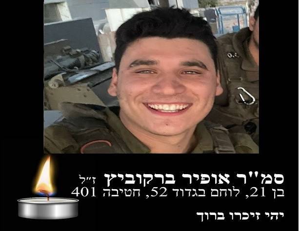 בצער רב התבשרנו במהלך השבת על נפילתו של תושב העיר, סמל ראשון אופיר ברקוביץ ז"ל, בן 21, לוחם בגדוד 52 של חטיבה 401, חיל השריון, שנהרג בלחימה בעזה.
