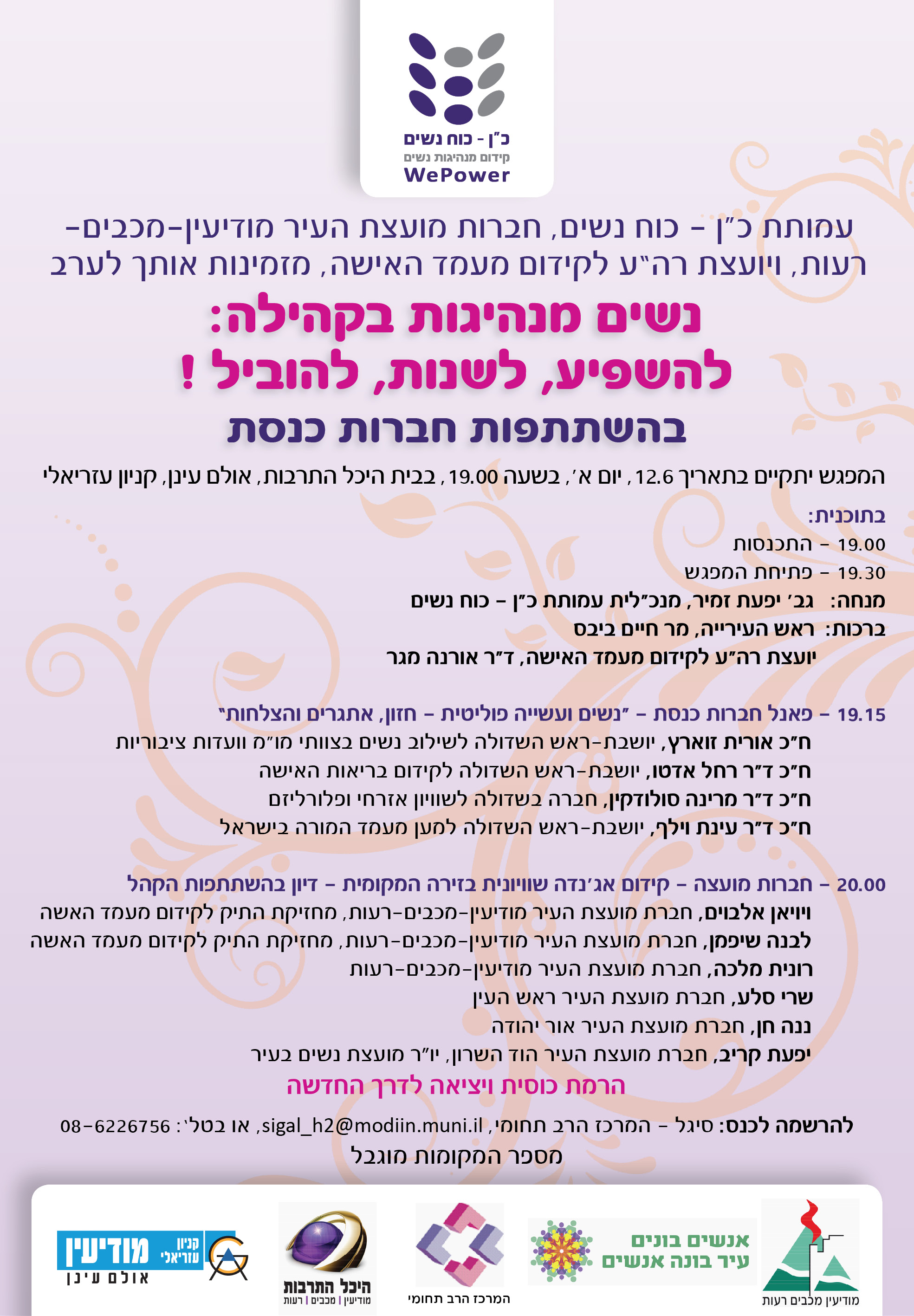 עיריית מודיעין מכבים רעות תקיים ביום ראשון, 12.6.11, כנס בשיתוף עמותת כ"ן (כוח נשים), עבור נשות העיר והסביבה בנושא "נשים מנהיגות בקהילה: להשפיע, לשנות, להוביל". האירוע יתקיים באולם עינן בעזריאלי החל מהשעה 19:00.