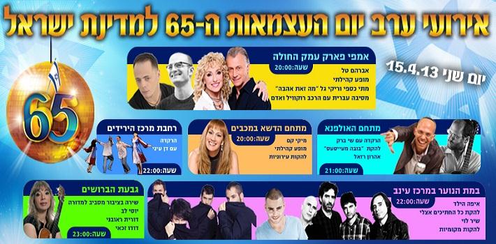 ביום שני בערב תחגוג מדינת ישראל את ערב יום העצמאות. גם במודיעין, מכבים רעות יציינו את יום העצמאות במספר בימות בידור לכלל אוכלוסיית העיר: באמפי פארק עמק החולה יופיעו הזמרים אברהם טל, מתי כספי וריקי גל. ברחבת הדשא מרכז מכבי עולמי – מכבים יתקיים המופע "ולתפארת מדינת ישראל" מופע מקורי המהווה מחווה למקבלי פרס ישראל בתחום התרבות בהשתתפות השחקנית והקומיקאית מיקי קם. באולפנא "אורות מודיעין" יופיעו הזמר אהרון רזאל, להקת 'בובה מעייסעס' במופע רוק יהודי והרקדה עם שי ברק ולהקתו.
