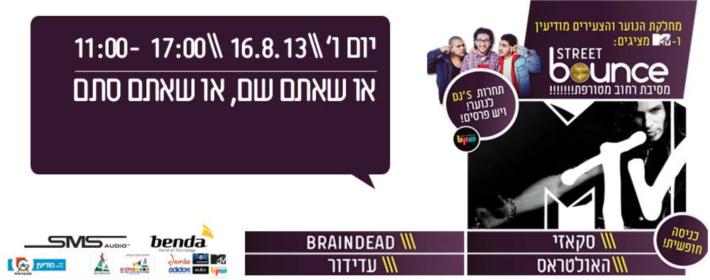 בפעם הראשונה במודיעין מכבים רעות תתקיים ביום שישי הבא מסיבת רחוב ענקית "Street Bounc 2013". האירוע, שנערך בהפקה משותפת של מחלקת הנוער והצעירים, ערוץ המוזיקה "MTV ישראל" ובחסות קניון עזריאלי מודיעין והמכללה למוסיקה BPM, מיועד לבני נוער מגילאי 14 ומעלה וצפויים להגיע אליו חוגגים רבים.