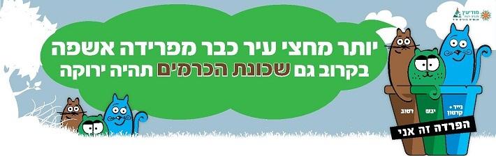 פרויקט הפרדת פסולת במקור של עיריית מודיעין מכבים רעות בשיתוף המשרד להגנת הסביבה בעיר יצא בשבוע שעבר לדרך גם בשכונת הכרמים. כידוע, העיר מודיעין מכבים רעות חרטה על דגלה את נושאי איכות הסביבה והטיפול בפסולת כחלק מתפיסת עולם ובמטרה לשפר את חיי תושביה. לכן החליטה העירייה על יישום תהליך הפרדת פסולת במקור לשני זרמים, זרם רטוב וזרם יבש. השבוע החל צוות פרויקט ההפרדה להדריך את תושבי שכונת הכרמים, לקראת כניסת השכונה לפרויקט הפרדה במקור.
