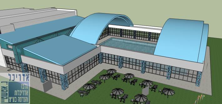 הדמיית קירוי הבריכה. באדיבות גלפז אדריכלות והנדסהבימים אלה החלו בבריכה העירונית בביצוע העבודות, בהתאמת מערכות הצנרת והולכת המים, בשילוב מערכות חימום במערכות הסינון, הטיהור והולכת המים ובביצוע התכנון ההנדסי המפורט. הקירוי המתוכנן יותקן על כל שטח הבריכה הראשית והבריכה הלימודית, שטח כולל של כ-900 מ"ר. גגות הקירוי מתוכננים בשני מקטעים: מעל הבריכה הלימודית יותקן קירוי קבוע, אשר יאפשר לרוחצים לצאת מהמלתחות אל שטח מקורה ומחומם, ומעל שטח הבריכה הראשית יותקן קירוי קמור המחולק לארבע חלקים, שני חלקים קבועים ושני חלקים ניידים. החלקים הניידים יישלטו על ידי מערכות חשמליות ומנועים, אשר יאפשרו את פתיחת הגג בימי הקיץ וסגירתו בימי החורף.