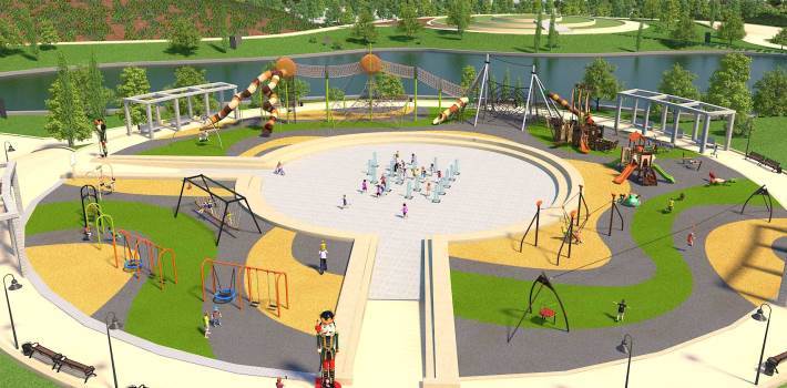 מסביב לרחבה יוצבו מתקני משחק שונים, כאשר המתקן המרכזי יהיה מתקן משחקים משולב בגודל שלא קיים כמוהו בעיר. מדובר במתקן טיפוס והליכה מכבלים בגובה, במסלול היקפי, המשולב עם מגלשות. המתקן בנוי מפירמידות, כבלים וגשרים סגורים.