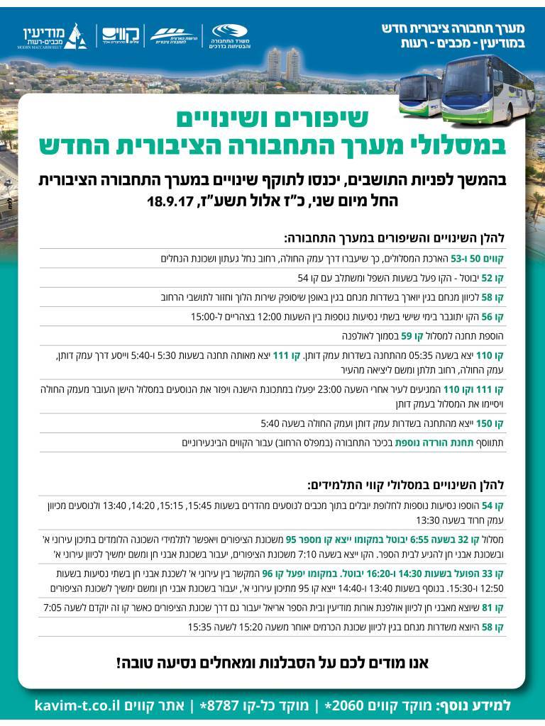 כאמור בישיבה שנערכה ביום ראשון סוכם על שינויים במערך התחבורה שיחולו החל מיום שני הקרוב ואלה השינויים: