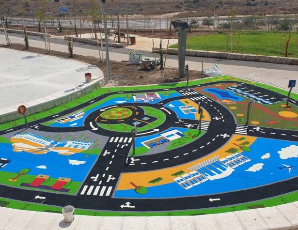 המסלול החדשני מדמה את העיר מודיעין מכבים רעות הפרושה בציורים על מרחב דשא סינטטי צבעוני. כך, שגם הקטנטנים ייהנו "מנסיעה" עירונית ויפגשו את המע"ר (מרכז העיר החדש), הרכבת, בניין העירייה, את שכונת נופים וכמובן תמרורים ורמזורים.