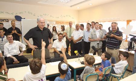 ראש הממשלה ושר החינוך בליווי ראש העיר חיים ביבס התחילו את הביקור בכיתה ג' בביה"ס יחד שם קיבלו את פניהם התלמידים הנרגשים. ראש הממשלה לחץ ידיים למרבית הילדים ואף ביקש לשמוע את שמם.