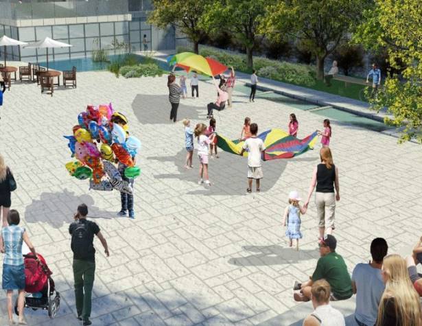מן החניון ניתן יהיה להגיע במעלית ישירה למפלס הרחוב אשר יוקם כרחבת ירידים פתוחה עם מבנה מסחרי חד קומתי בדגש על מסעדות ובתי קפה. בנוסף, תשמש רחבת הירידים לאירועים עירוניים שונים ודוכני אמנות ושווקים. בנוסף, יוקמו ברחבה טרסות ישיבה מעוצבות והצללות.