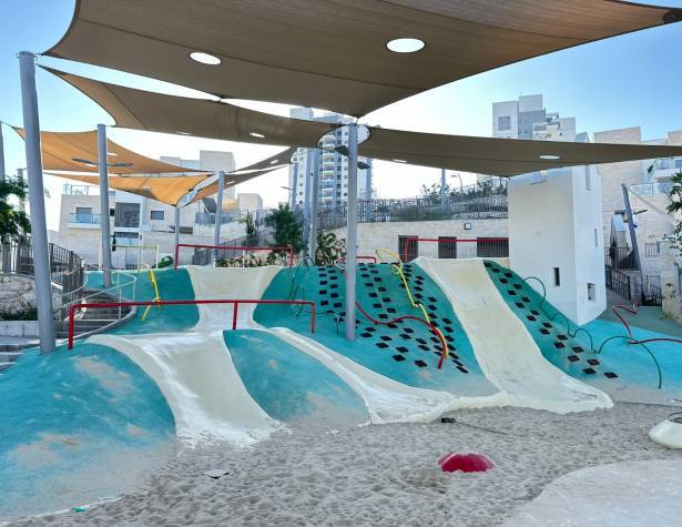 החלק המערבי – גן המשחק והדמיון: אזור זה כולל גן משחקים ייחודי הבנוי על מדרון תלול. קירות התמיכה שנדרשו למבנים שבסמוך שימשו כבסיס למערכת קירות משחק, טרסות ומדרונות – כולם מחופים באבן ובחומרים התואמים את שפת הבינוי של השכונה. המדרון הפך למרחב דינמי של משחקי דמיון, טיפוס וגלישה, בשילוב חוויית הרפתקה לילדים עם פינות ישיבה והצללה להורים.