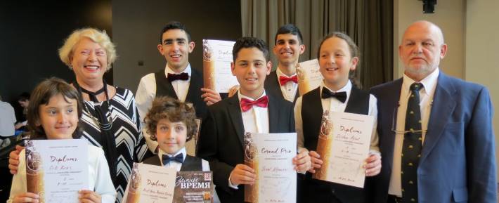 המורים עם התלמידים הזוכים. צילום: כפיר אלפנדריהתלמיד יובל אלפנדרי זכה בפרס הגבוה ביותר בתחרות – ב"גרנד פרי". נועם ונטורה, אסף גרון ואריאל רחמילביץ' זכו כל אחד בפרס על המקום, כאשר בנוסף ונטורה וגרון הופיעו עם דואט על פסנתר, אשר זיכה אותם גם כן במקום הראשון.