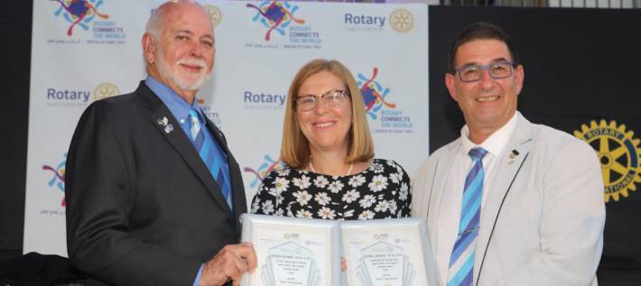 טקס הענקת פרס האזור למועדון רוטרי מודיעין. נשיאת מועדון רוטרי מודיעין, שירלי מזרחי (במרכז) מקבלת את הפרס מידי הנשיא העולמי של ארגון רוטרי, בארי ראסין (משמאל) ונגיד רוטרי ישראל היוצא, אלון בנדט.
