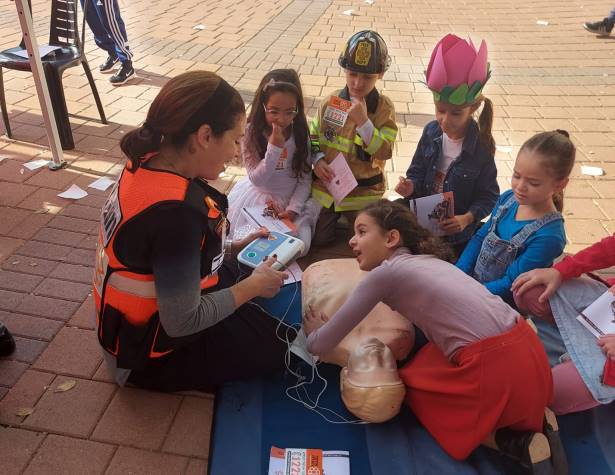בנוסף, קיבלו הילדים הסברים מעניינים על ציוד התרגול לסיוע במצבי חירום כמו סימולטור היימליך, בובת החייאה ועוד, המשמשים להדרכות חשובות ותרגול המתנדבים. הילדים סיירו בין תחנות ההדרכה ומאוד נהנו.