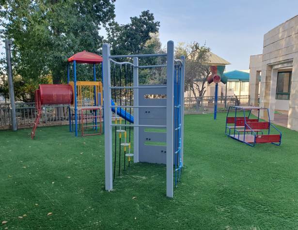 בכל החצרות הותקנו הצללות ומדשאות דשא סינטטי. בנוסף, הוחלפו מתקני המשחק למתקני משחק חדשים ומודרניים הכוללים גם מתקני נינג'ה מעוצבים בהשראת אלמנטים בחלל, בהתאם לרוח בית הספר והגנים. כמו כן, שודרגו ארגזי החול.