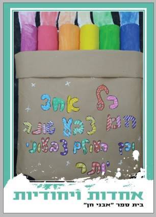 "אחדות וייחודיות – שומרים על אחדות שומרים על ייחודיות" דרך מגע ידיהם של תלמידנו המיוחדים. בביה"ס שלנו לומדים תלמידים בעלי לקויות תקשורת ובעלי מוגבלות שכלית התפתחותית. בית הספר משמש כבית חינוך הנותן מענה לימודי חברתי וטיפולי כדי לזהות ולקדם כל תלמיד בפוטנציאל הגלום בו. יצירה משותפת זו נעשתה כחלק מתחושת השייכות והיכולת האישית של כל אחד ואחת לתרום ליצירה המשותפת אם בציור או קרמיקה.
