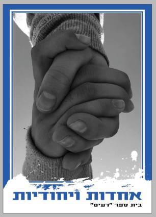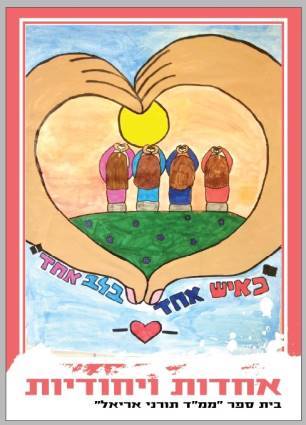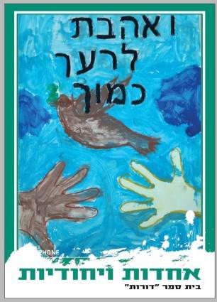 "ואהבת לרעך כמוך"-.המשפט ו"אהבת לרעך כמוך" מדבר על לאהוב את חברך כפי שאתה אוהב את עצמך. בחרנו לצייר את כפות הידיים שלנו. צביעת כפות הידיים נעשתה בגוונים שונים, כדי להראות שלמרות הייחודיות של כל אחד מאתנו אנו מאוחדים כחברים טובים.