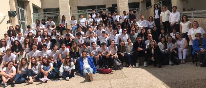 בני הנוער בתמונה משותפת בתיכון עירוני ב'לראשונה מאז החל מיזם זה השתלבו במסגרת ביקורם של האמריקנים גם מפגשים עם בני נוער מבתי ספר במודיעין מכבים רעות.