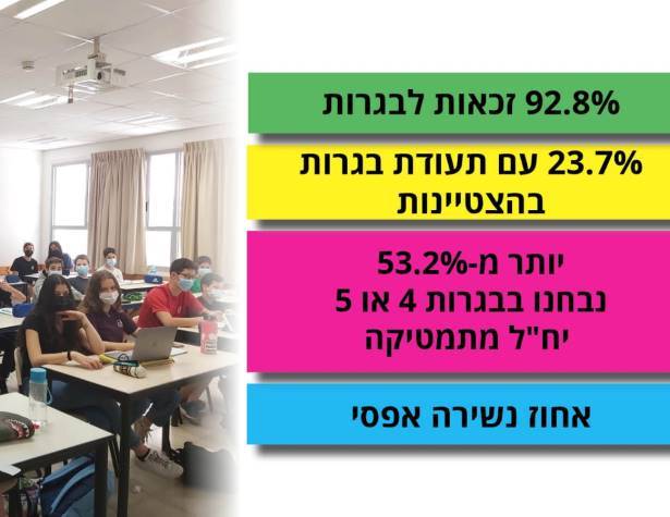 גם במספר התלמידים שעשו בגרות 4 ו-5 יחידות מתמטיקה, אחד המקצועות המאתגרים שמינהל החינוך העירוני שם לו למטרה לקדם ולעודד בקרב התלמידים, נמשכת מגמת הגידול במספר התלמידים הנבחנים ל-4-5 יח"ל. השנה נתון התלמידים הוא 53.2% כאשר 26.6% מהתלמידים ניגשו לבגרות 5 יח"ל. גידול של יותר מ-60% לעומת הנתון לפני חמש שנים אז עמד מספר הניגשים לבגרות 5 יח"ל במתמטיקה על 15%. עלייה באחוז הנבחנים גם בבחינה של 5 יח"ל באנגלית 5 כאשר בשנת הלימודים תש"ף ניגשו 73.3% מהתלמידים. גידול של 3.5% לעומת נתון הניגשים בשנה"ל תשע"ח שהיה 68.7%. הנתון הארצי לניגשים ל-5 יח"ל הוא 41.5% בלבד.