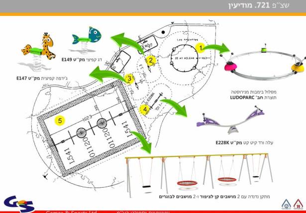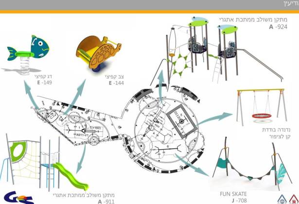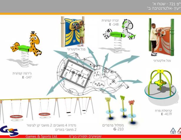 מתקן משולב, אתגרי הכולל קרוסלה אישית, מוט כבאים לגלישה, ועוד, נדנדה בודדת מסוג "קן לציפור), נדנדות לפעוטות של דג וצב ומתקן אתגרי נוסף ובו מתקן טיפוס ומגלשה.